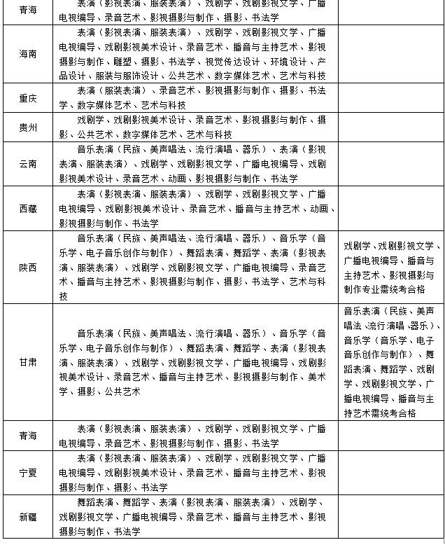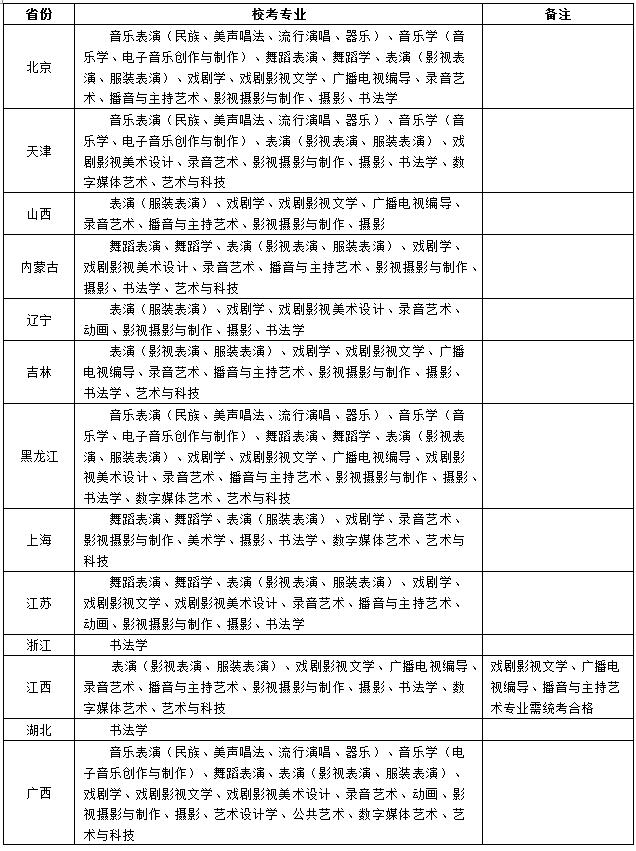 各省(直辖市、自治区)校考专业见下表: