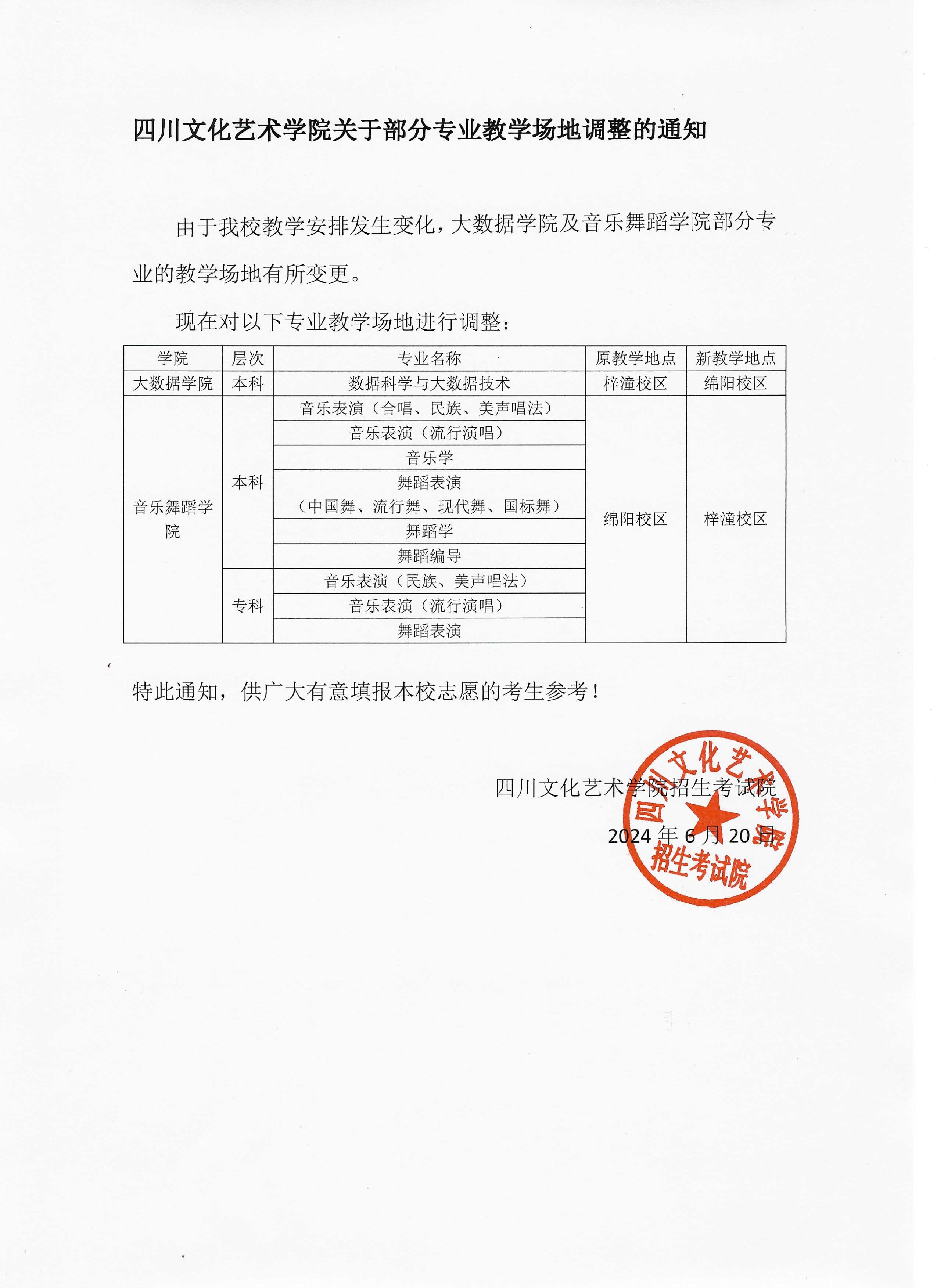 四川文化艺术学院关于部分专业教学场地调整的通知