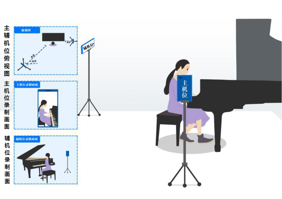 [主机位竖屏拍摄(考生侧脸、手部及琴键不能离开拍摄范围),辅机位横屏拍摄(考试全场监控)]